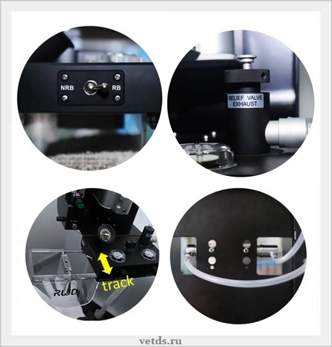 Наличие манометра, клапана APL, уникального устройства испарителя, расходомера, модулей клапанов вдоха и выдоха, а так же других регулирующих устройств позволяет установить безопасное дозирование анестезирующего газа для животного.
