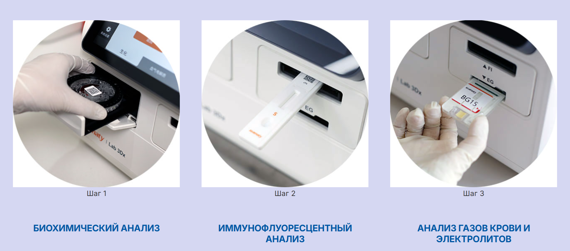 Seamaty Lab 3Dx объединяет биохимические исследования, иммунофлуоресцентный анализ и определение газов крови с электролитами в одном приборе, позволяя одновременно тестировать до пяти образцов.